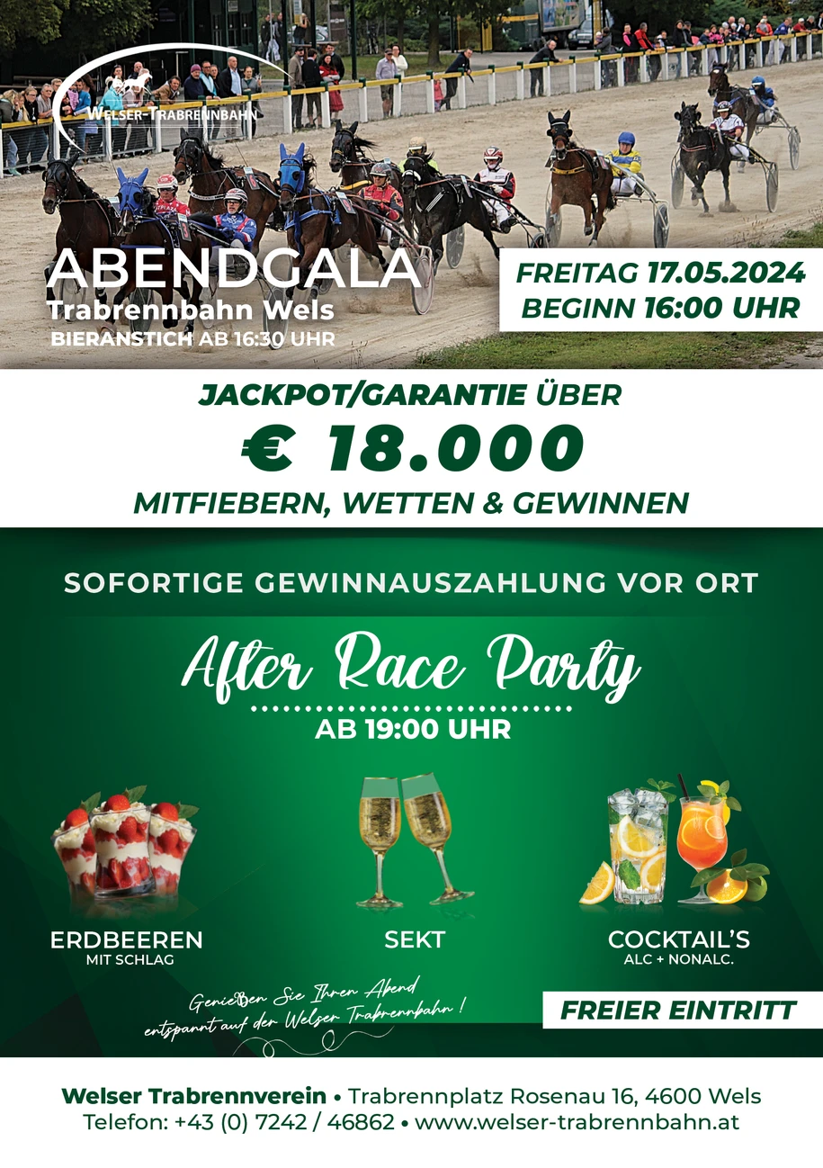 Am Freitag, 17. Mai 2024 um 16:00 Uhr - findet die Abendgala bei freiem Eintritt - auf der Welser Trabrennbahn (Rosenau 16, 4600 Wels) statt.
